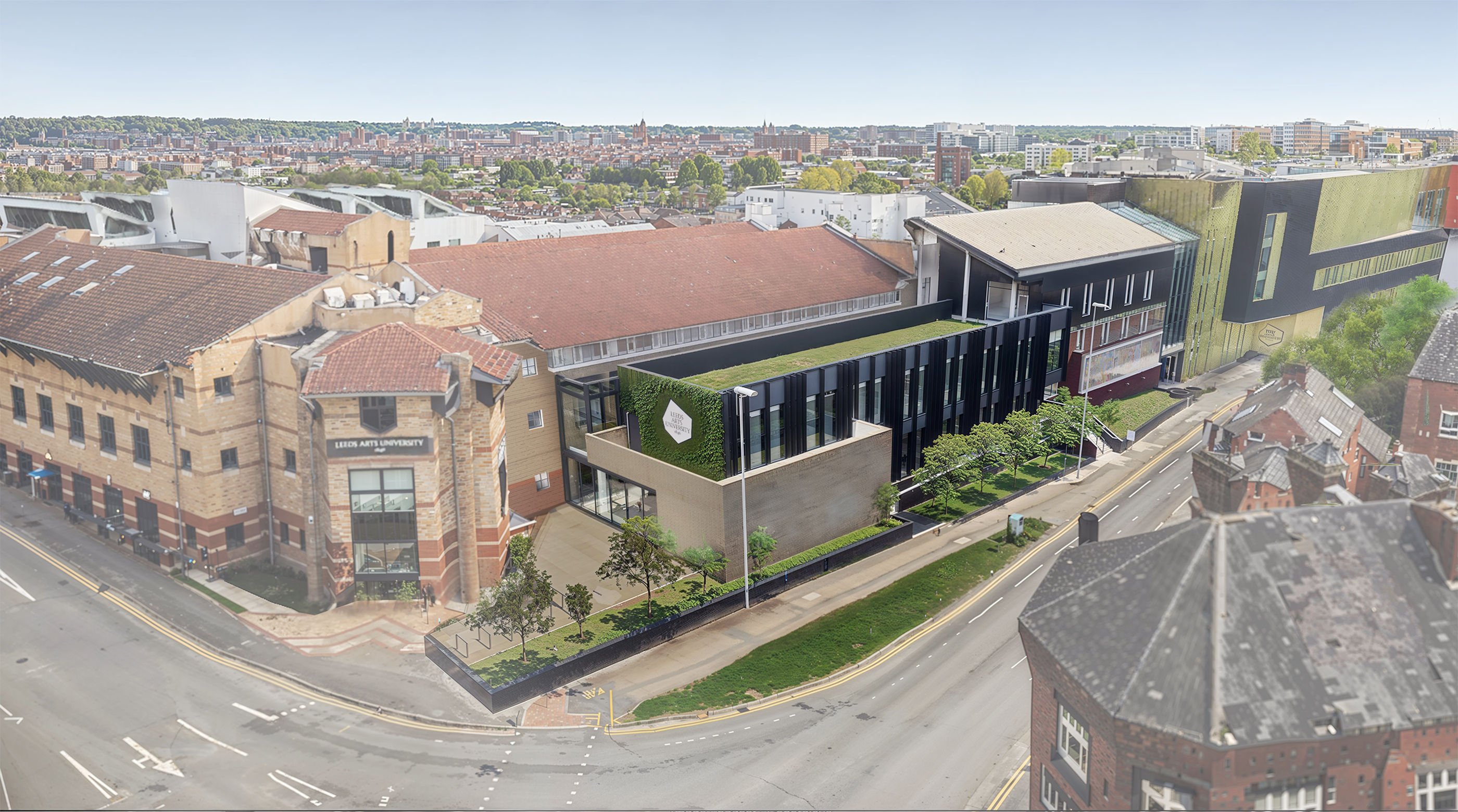 A new 2-storey extension to the existing building, adjacent to a public highway on a constrained site. The new facility will include an entertainment space, a teaching studio at the first-floor level and a café area at the roof level, next to a new PV array and rooftop garden.