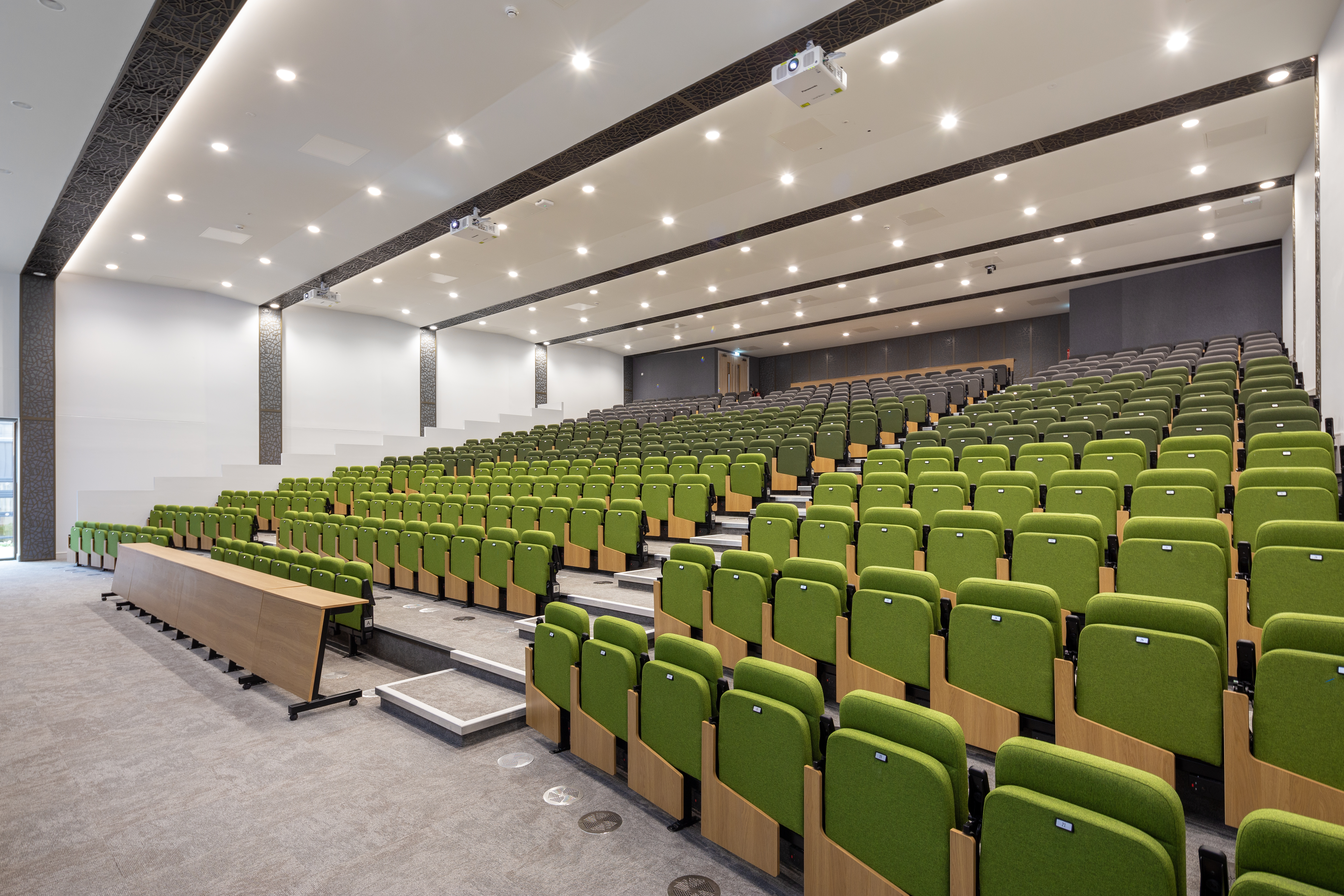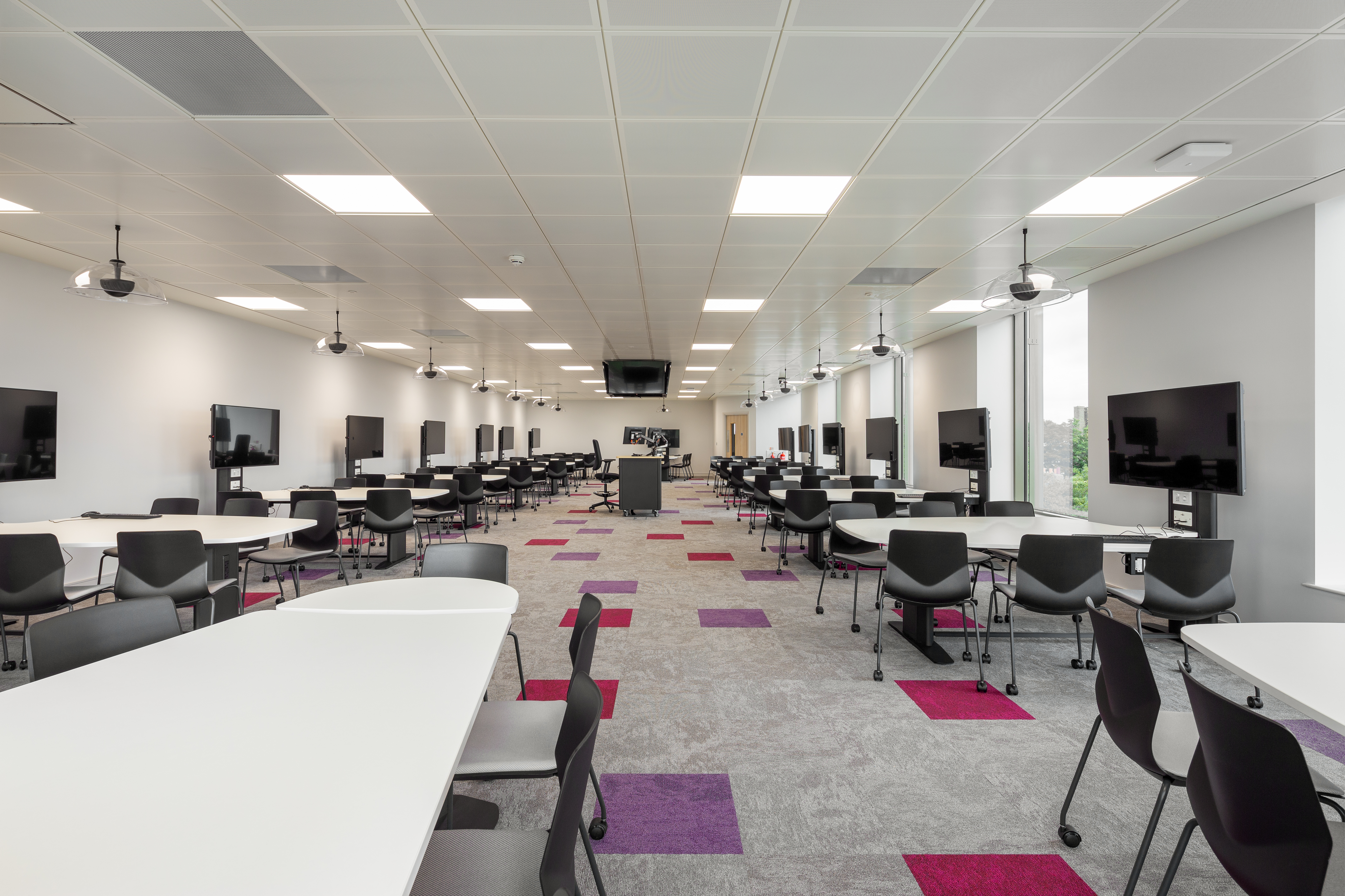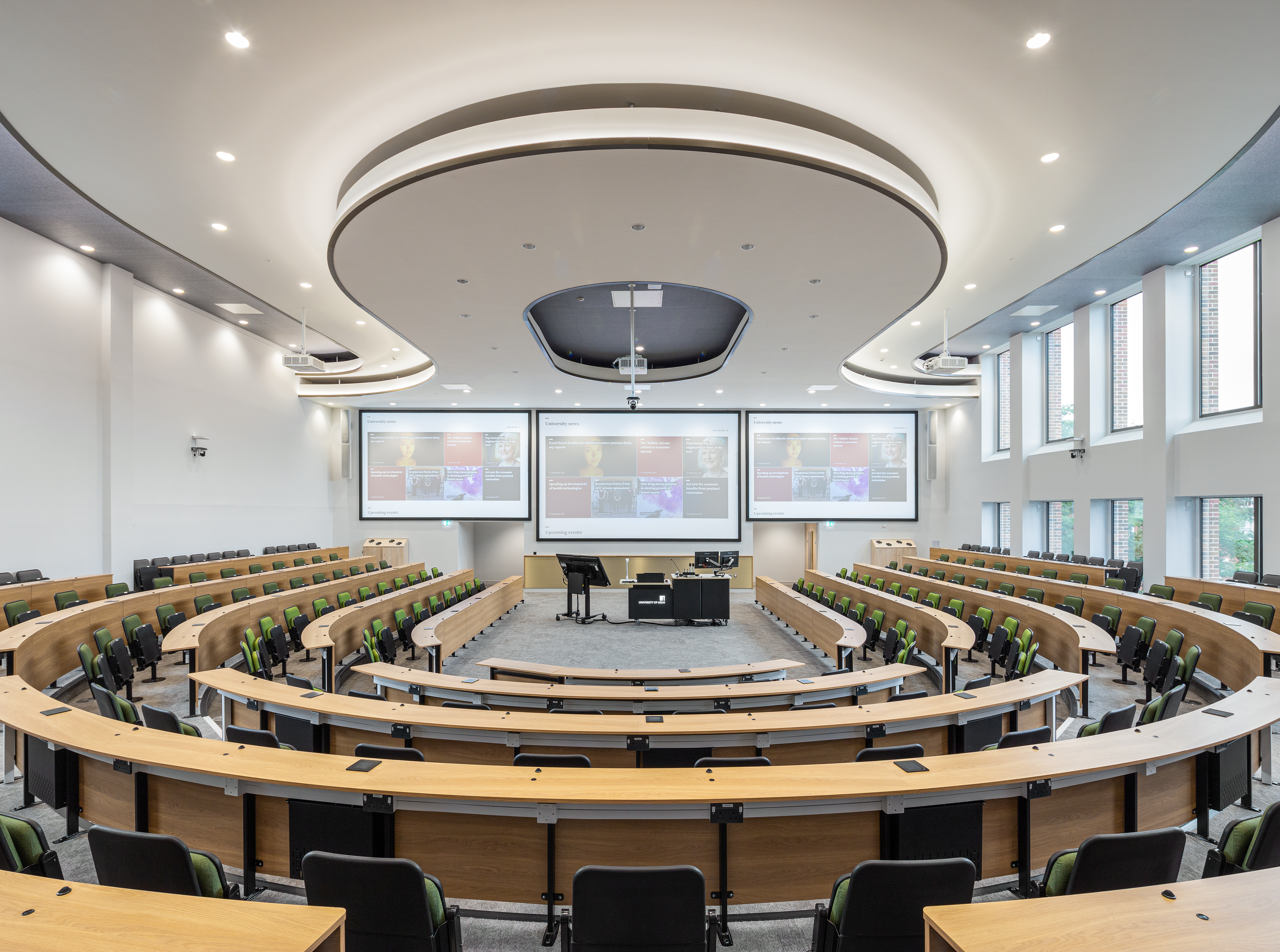 The building contains six principal teaching rooms alongside flexible learning areas, specialist behaviour laboratories and dedicated mock trading rooms equipped with continuous perimeter ticker‑tape displays. Two large auditoriums anchor the academic facilities, including a 390‑seat lecture theatre and a 240‑seat Harvard‑style theatre supported by integrated café space.