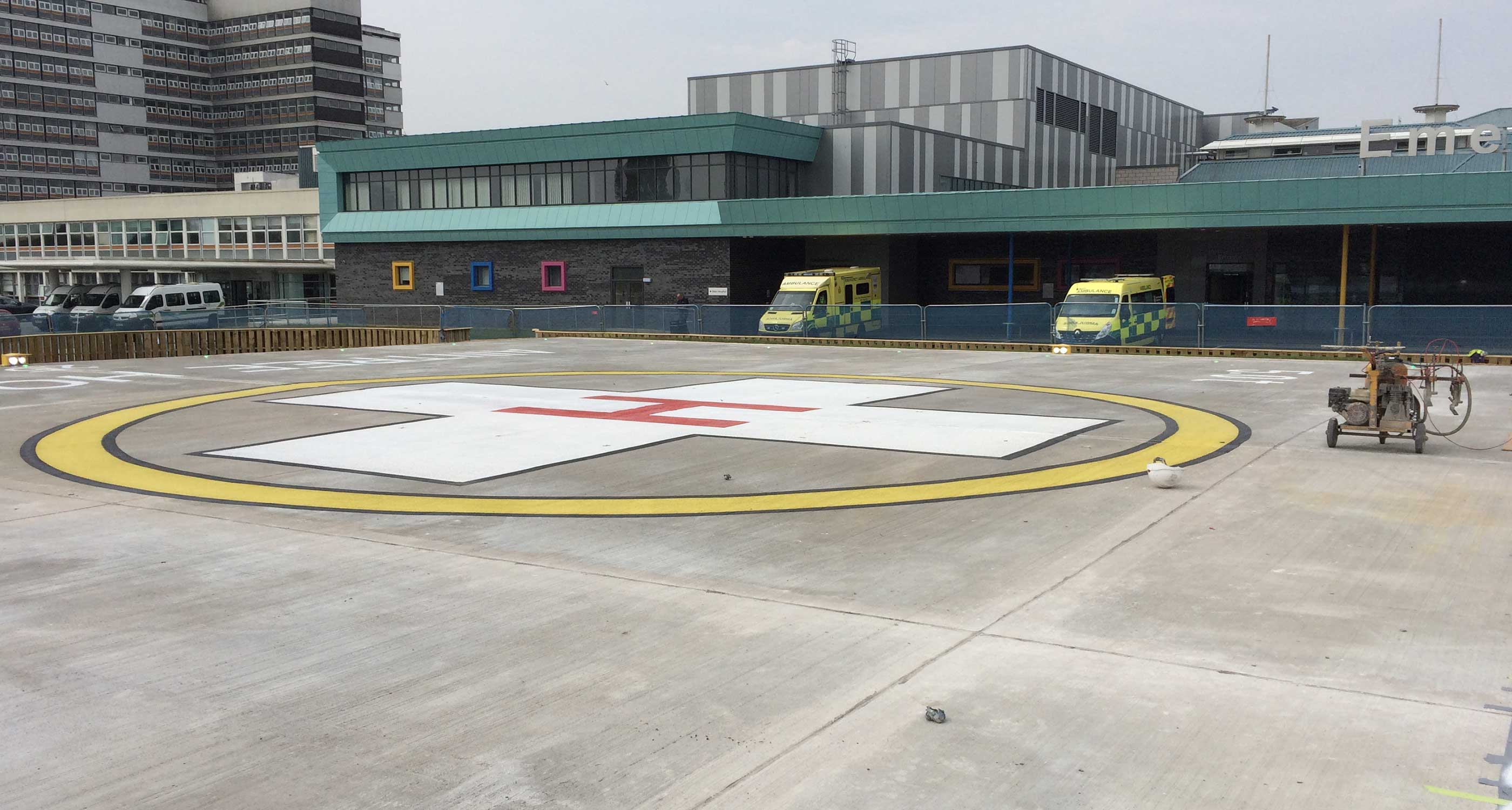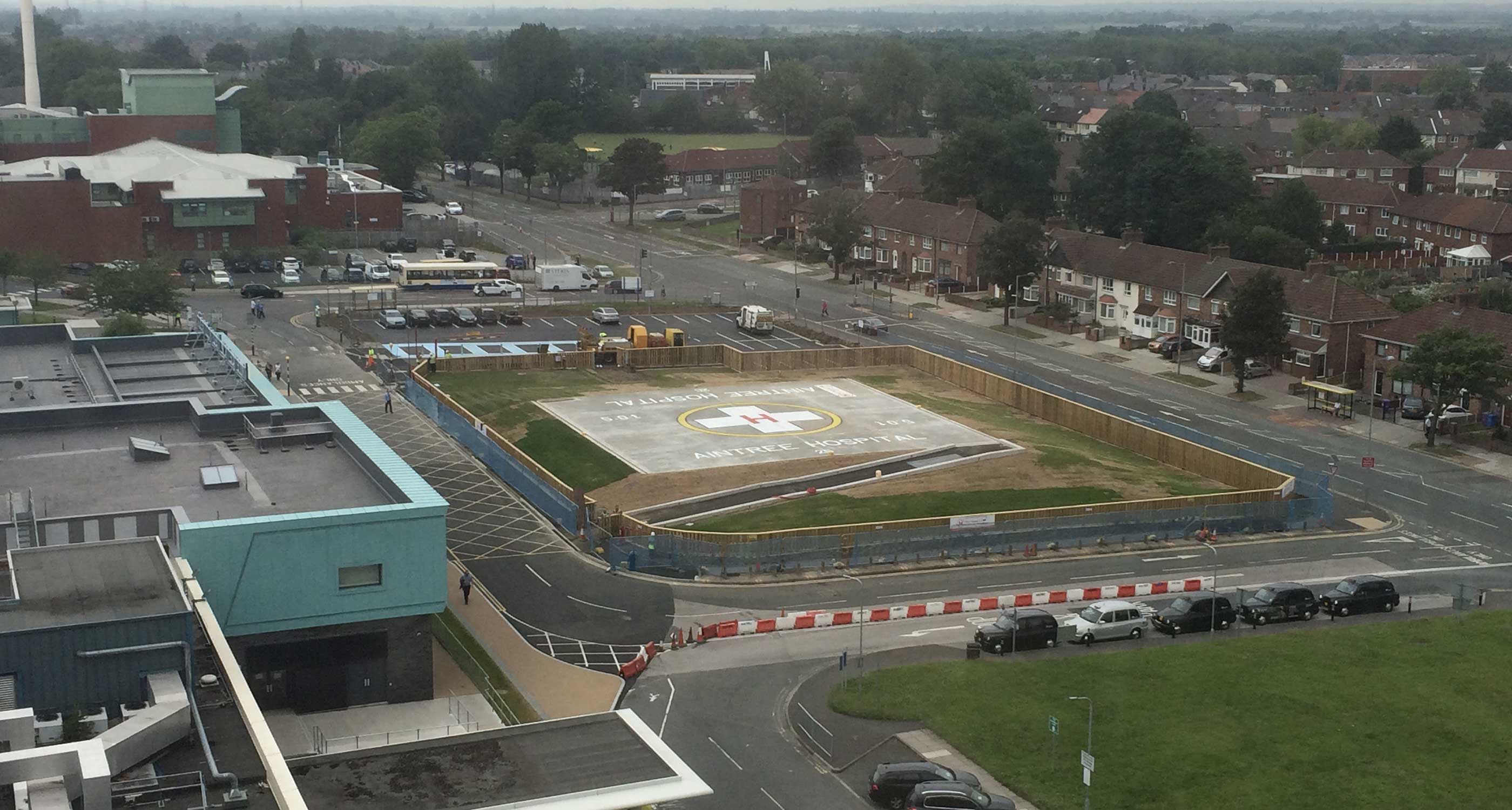 A raised helicopter landing pad based at Aintree University Hospital to reduce trasnfer time for critical patients to the hospital's Urgent Care and Trauma Centre.