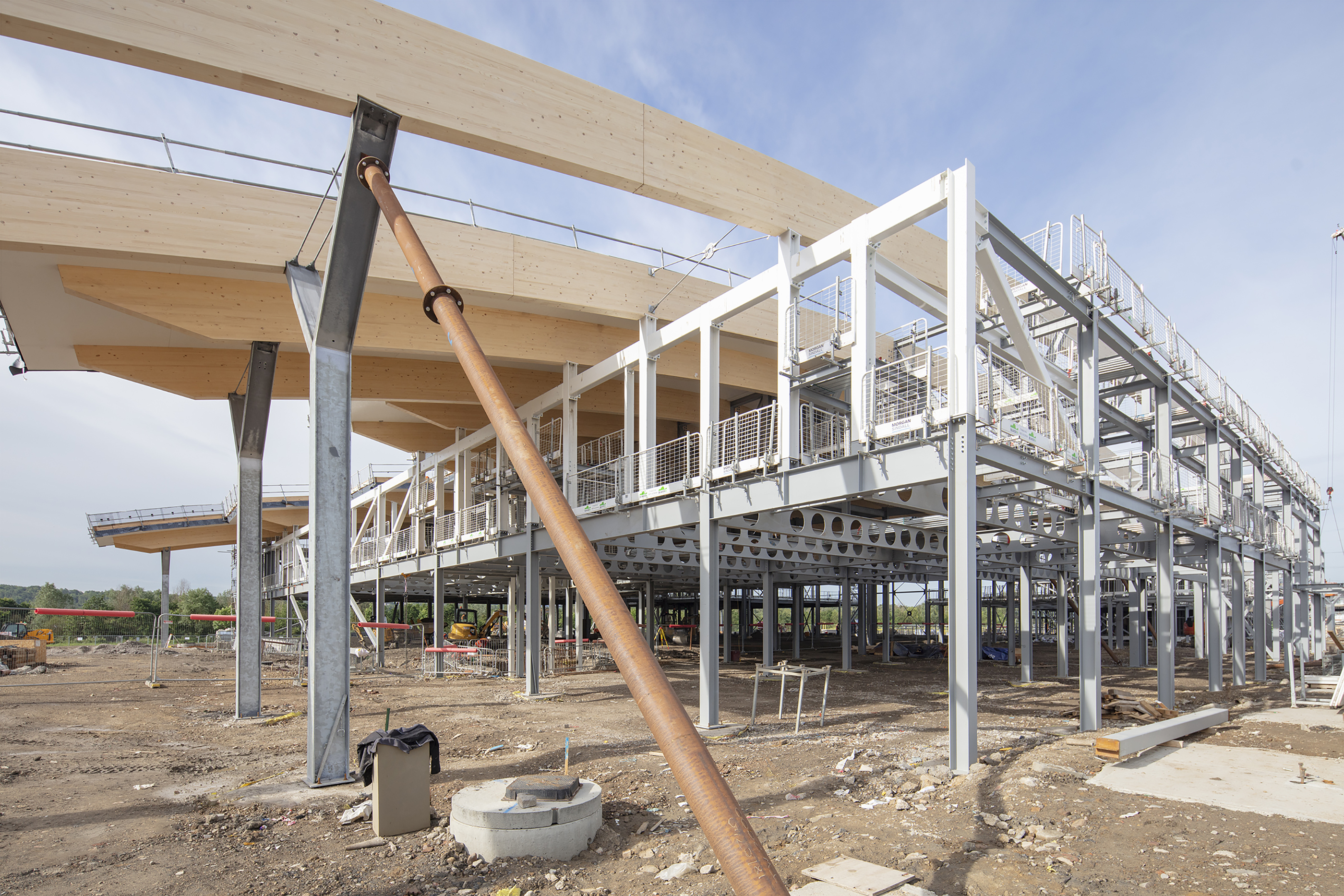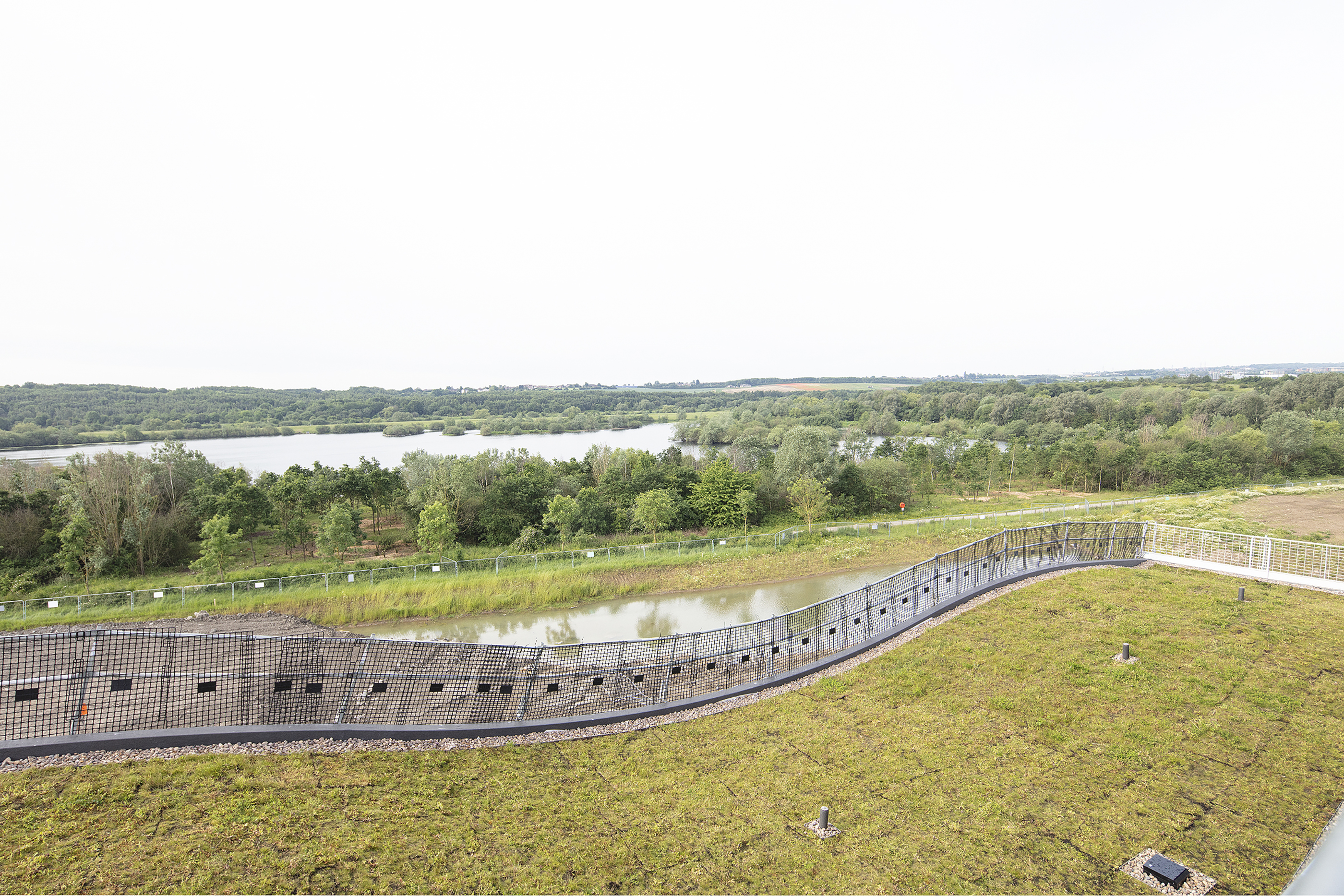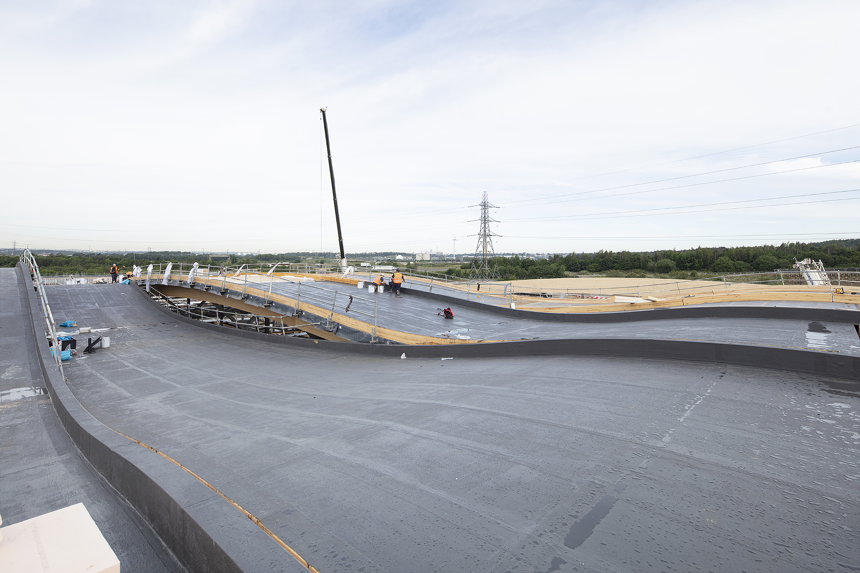 The development comprises a Facility Building and adjoining Hotel, with a curved ribbon living roof formed of glulam timber over-sailing and linking each of the building elements together. This creates a form that is not only dynamic but that relates to the surrounding context by responding to the layering of the wider area.