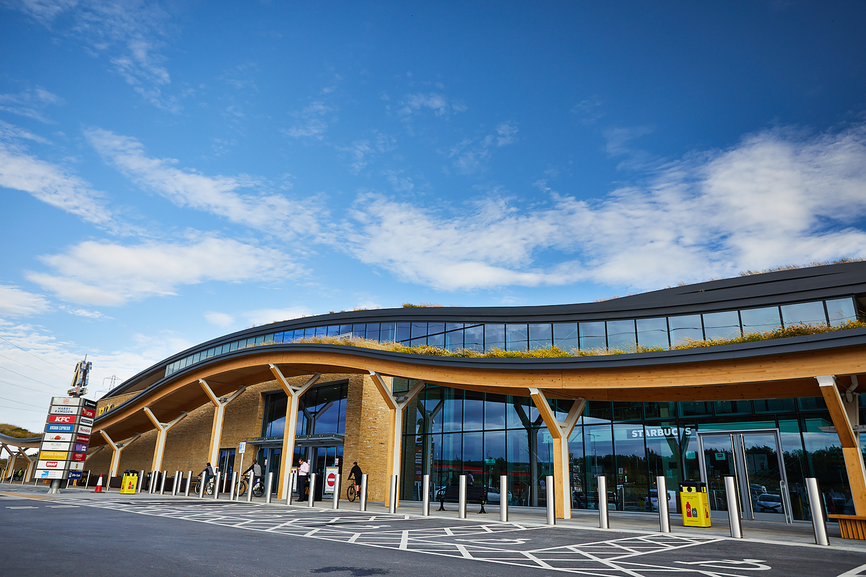 A new dynamic Motorway Service Station with a curved ribbon living roof, a variety of retail spaces and an adjoining 100-bedroom hotel.