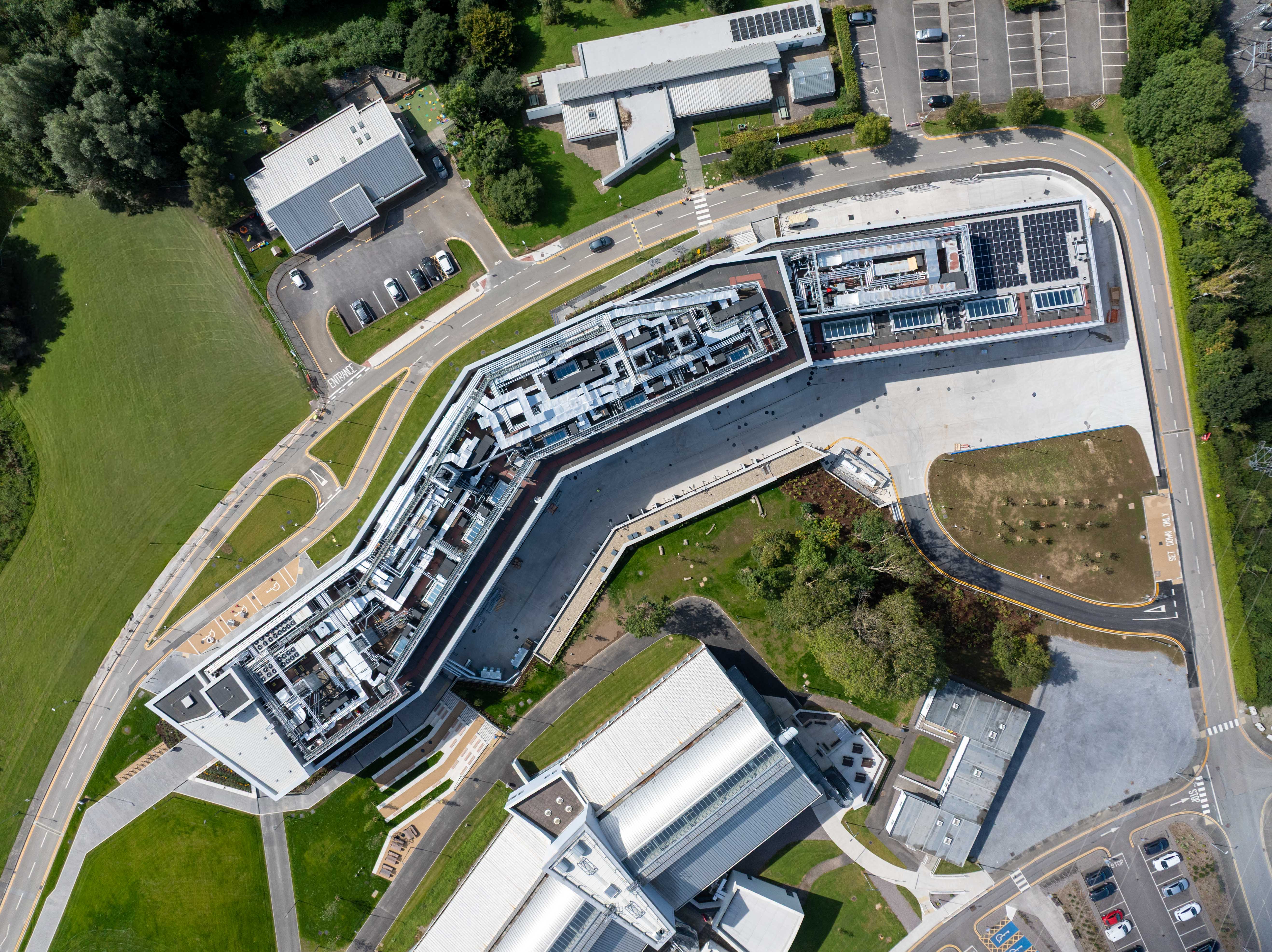 Additionally, a louvred plant‑area screen conceals rooftop plant from external view, and a covered plant area houses critical M&E equipment. Both are constructed using a galvanised, braced structural steel frame.