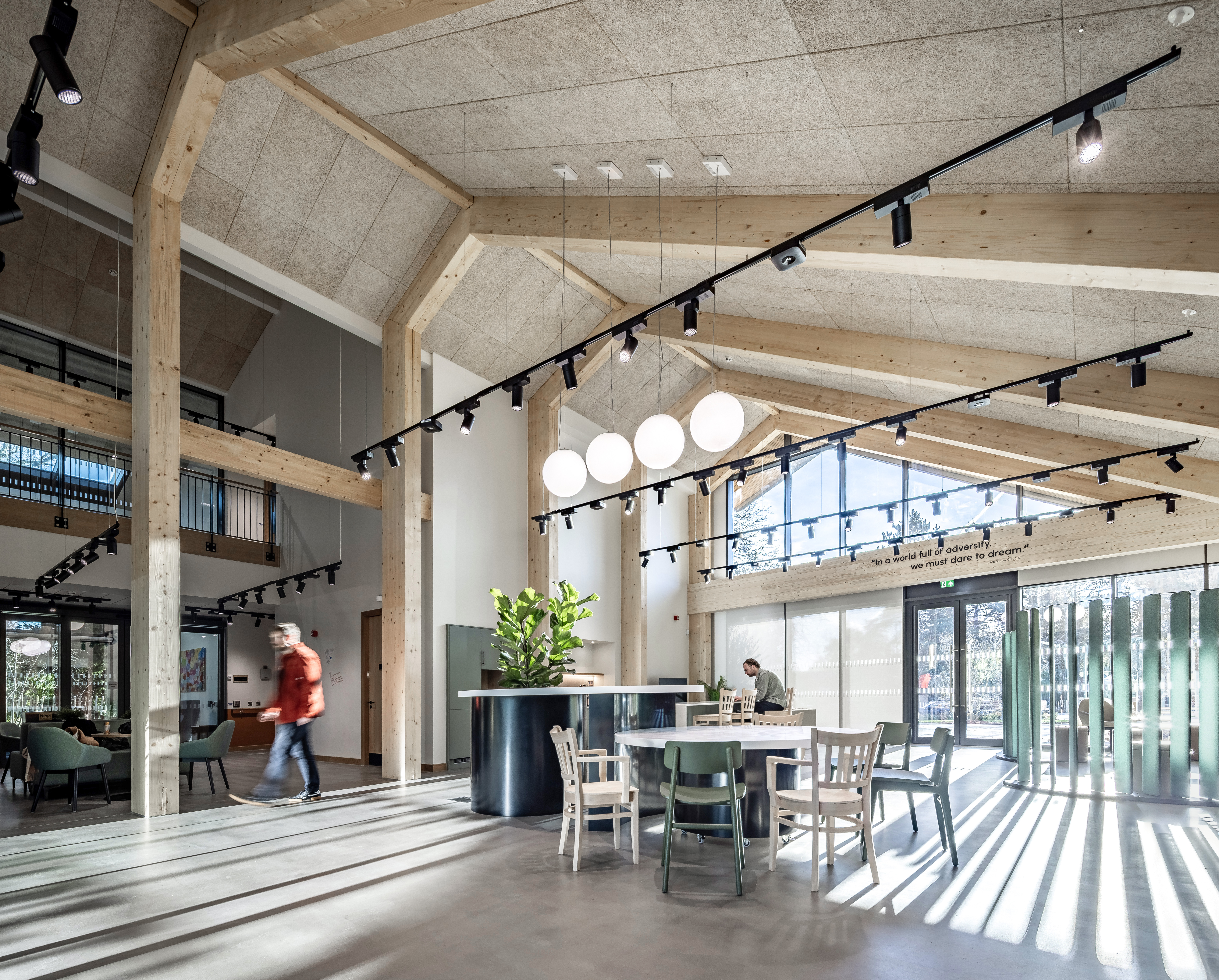 Long span glulam frame provides flexibility for internal reconfiguration over the building’s life cycle showing future adaptability of the structure.