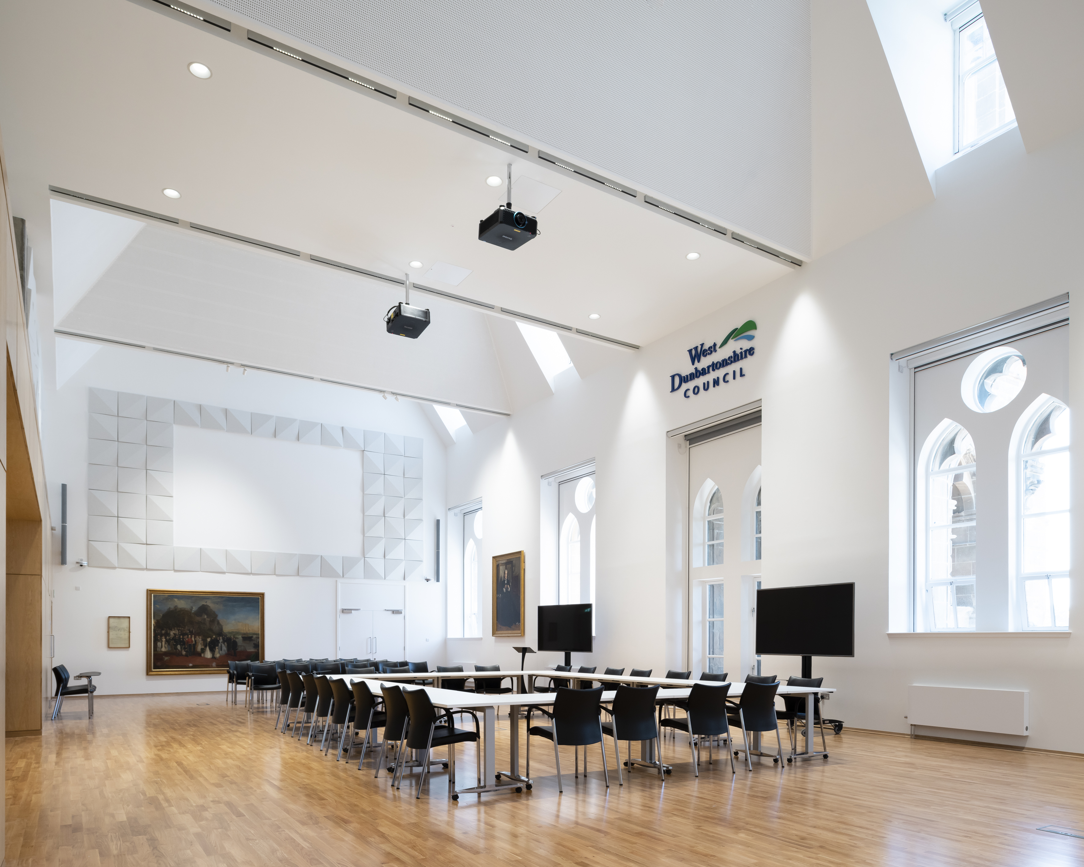 The existing Grade A listed façade, designed by William Leiper in 1865, formerly part of Dumbarton Burgh Halls, formed a key element of the design for the new office building. The offices aimed to deliver a 21st-century workplace interior, to create a sustainable and financially viable environment. The design for the new offices ensured natural lighting was maximised and a clear strategy for the future flexibility of the floor plates was secured. Our design provided for the future sub-division of floor plates with minimal future change. Visibility from the floor was designed to provide casual surveillance of surrounding streets, parking and drop-off areas. Open-plan workstations, meeting rooms and support spaces are key features. Support was provided by Historic Scotland and the project included input from Curtins’ CAREs engineer.