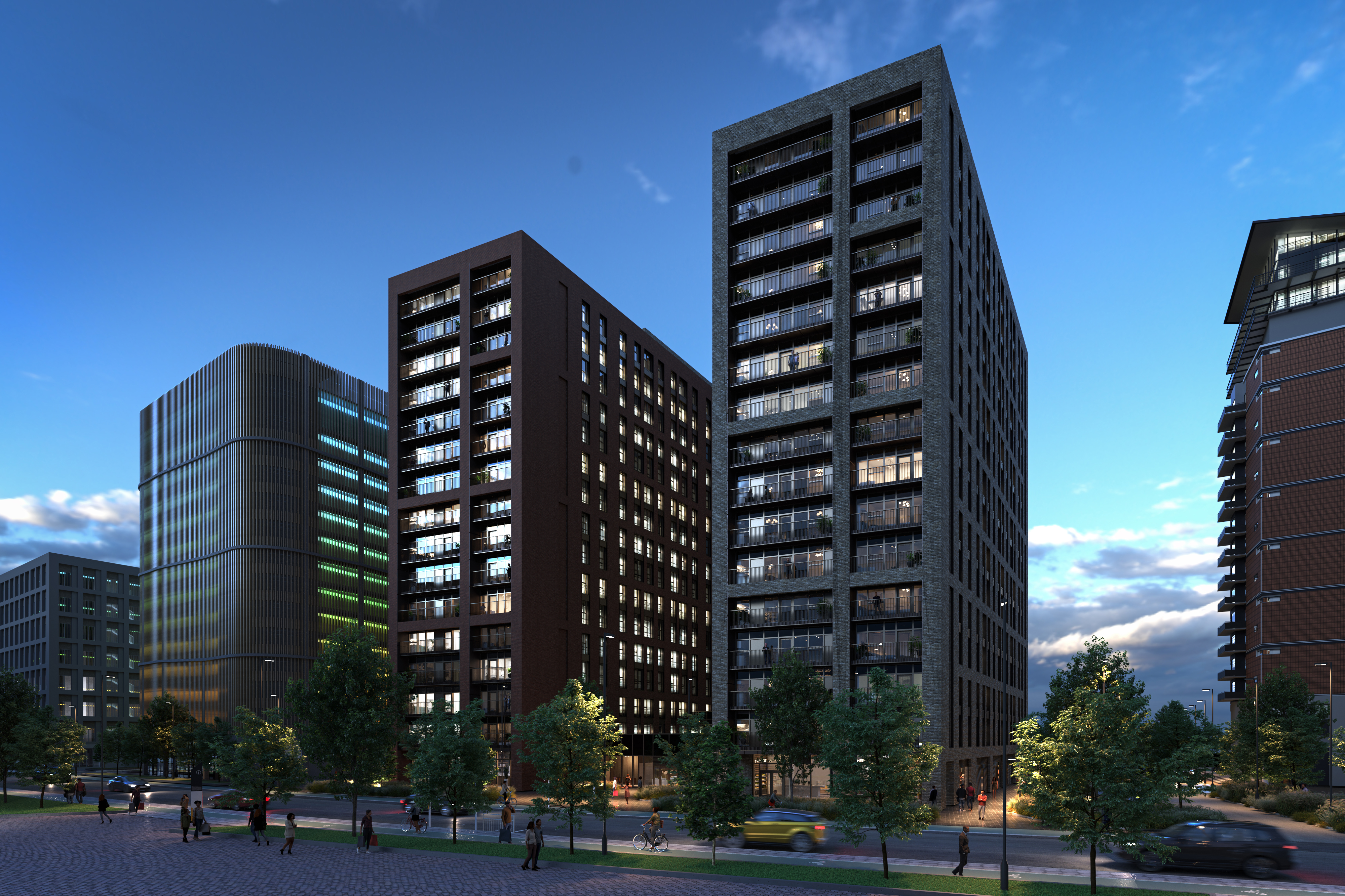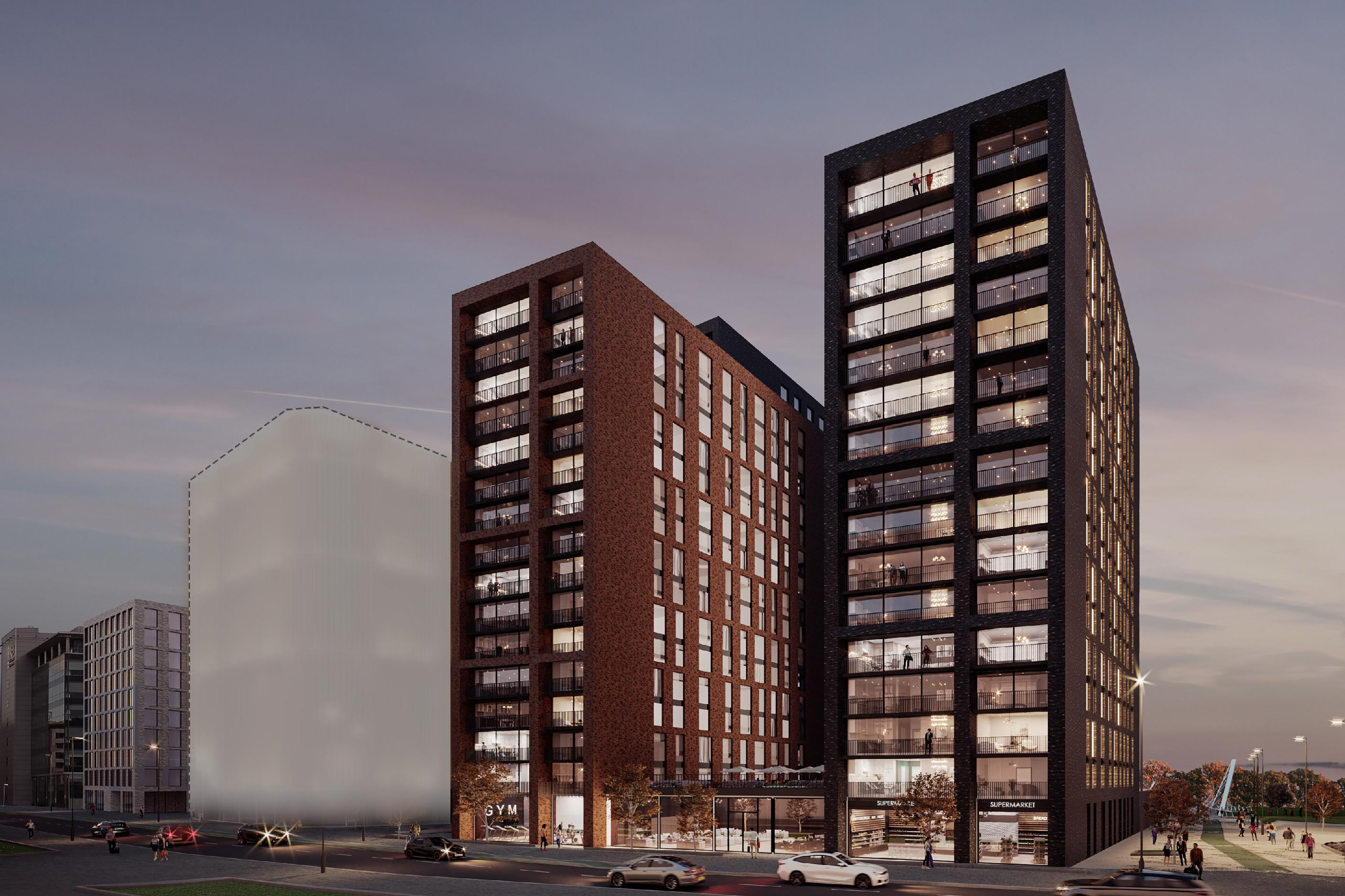 A large-scale residential and commercial development comprising two blocks - 16 and 18 storeys high. The buildings provide a mix of Grade A commercial units and car parking on the ground floor, with residential - 1, 2 and 3-bed apartments - on the upper floors.